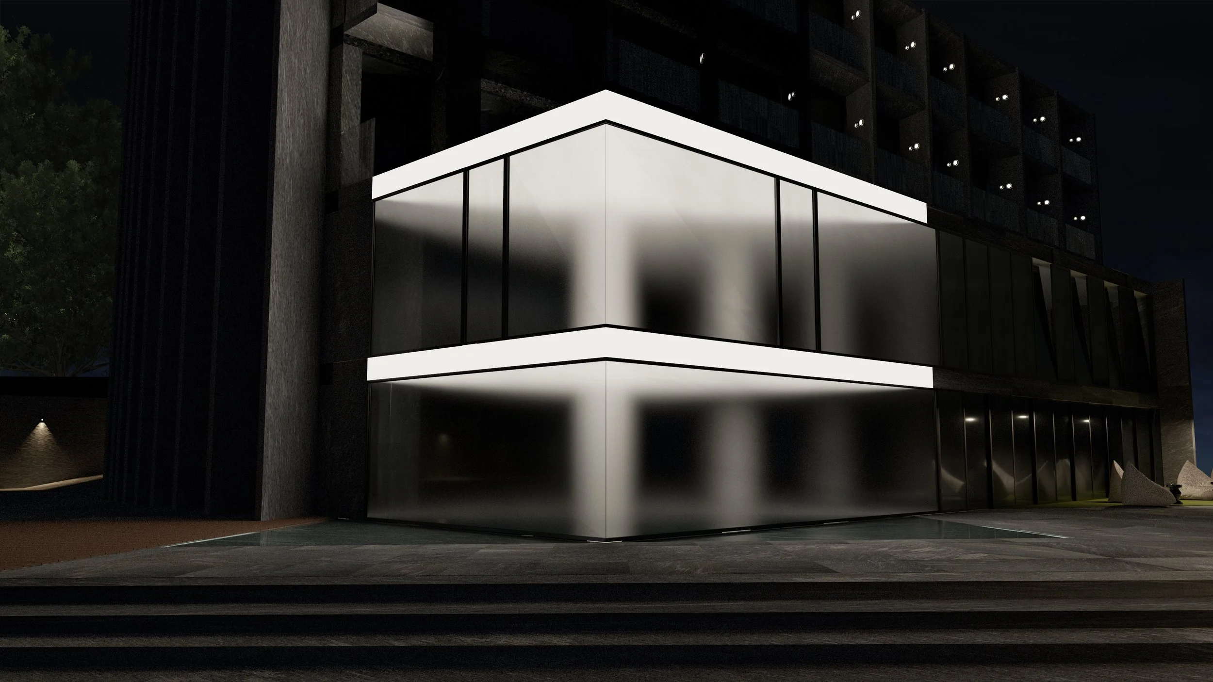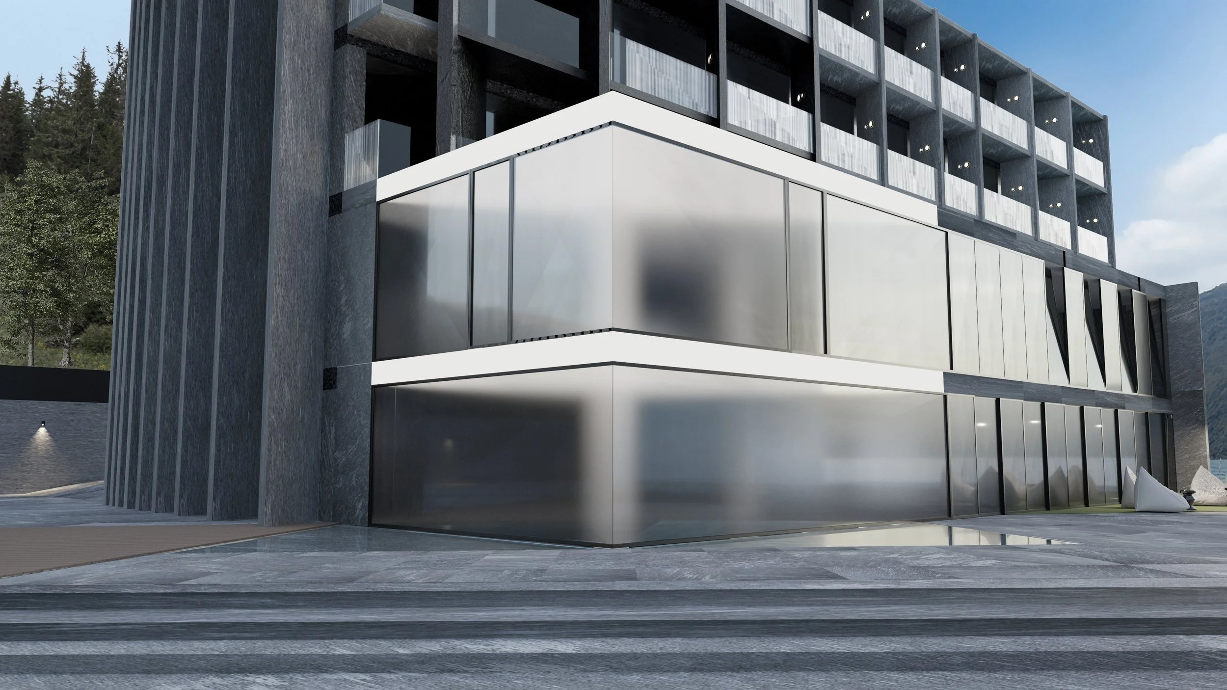 Sopra la discesa d’acqua si innalza la terrazza del ristorante che termina con il faro. L’accesso al lago avviene tramite una scalinata che scende verso il livello dell’acqua. Passando da un beach club in cui l’acqua si incanala rimanendo ad un livello molto basso si può accedere al lago in modo graduale.