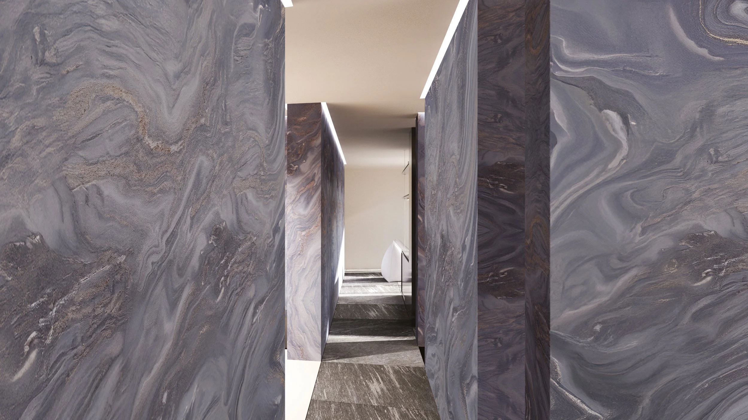 Il marmo divide l’intero spazio diventandone protagonista e conducendo Il visitatore nei vari spazi.